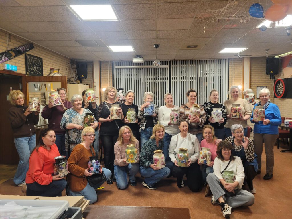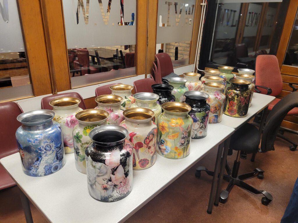 Het begon met knippen en plakken en naar een paar uur had iedereen een mooie vaas. Het was een hele klus maar het zijn prachtige vazen geworden.